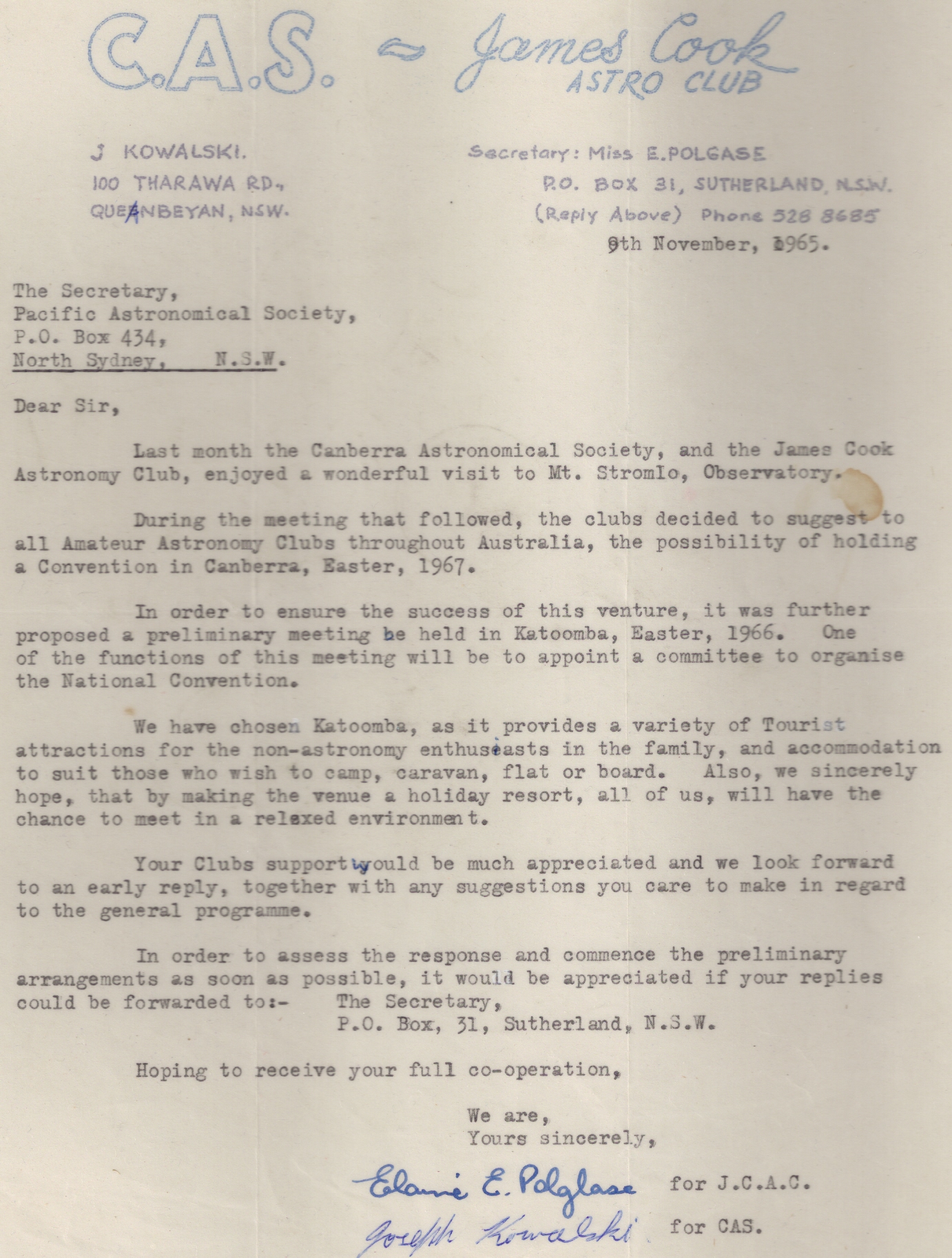 The attached image is a copy of the letter written by Joseph Kowalski (CAS) and Elaine Polgase (JCAC) to the Pacific Astronomical Society to seek their support.